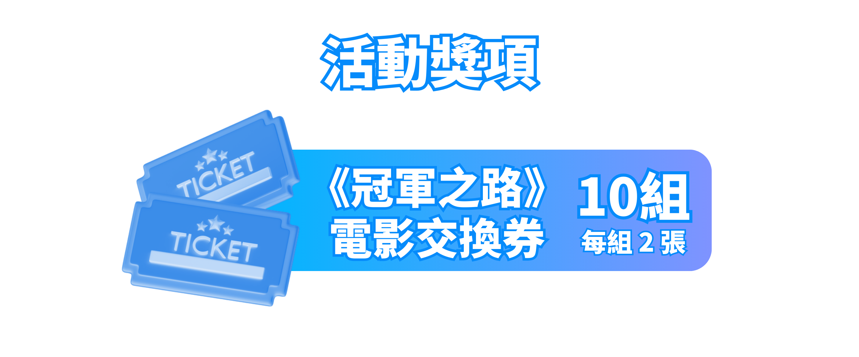 4.1 本活動將抽出共 10 組《冠軍之路》電影交換券,每組含 2 張電影票(下稱「獎品」)。